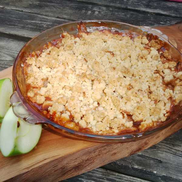1. 1. Preheat oven to 375°F. 2. To prepare the crust, in a medium bowl, mix together flour, sugar salt. 3. In a 1 cup measuring cup, mix together oil and orange juice. 4. Add the wet to dry. Mix until a crumbly dough is formed. 5. Press about 2/3 of the dough into a pie plate. Reserve the remaining 1/3 to crumble over the filling. 6. To prepare the filling, in a medium bowl, mix together the sugar, flour, and cinnamon. Set aside. 7. Prepare the apples by peeling, coring and thinly slicing them into a bowl with lemon juice. 8. Evenly incorporate the sugar/flour mixture and stir gently to coat. 9. Pour the seasoned apples onto the pie crust and crumble the reserved topping over the filling. 10. Bake for 60 minutes or until the top is brown and the filling is bubbling.